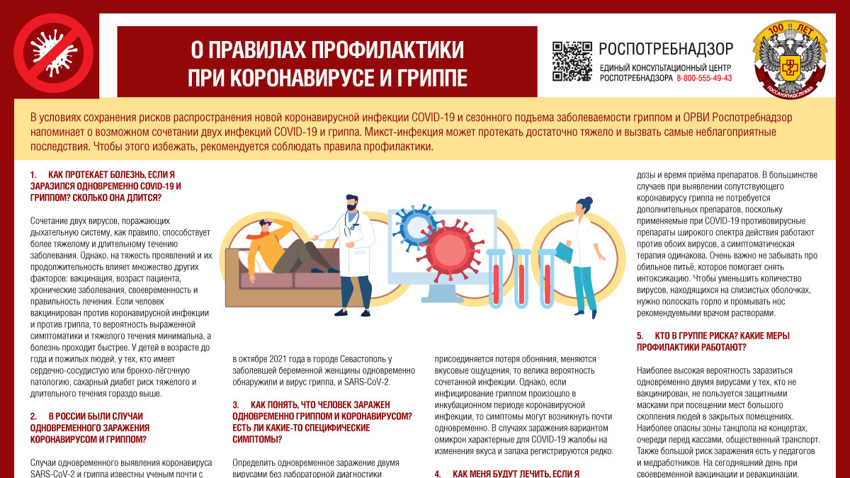 условиях сохранения рисков распространения новой коронавирусной инфекции COVID-19 и сезонного подъема заболеваемости гриппом и ОРВИ Роспотребнадзор напоминает о возможном сочетании двух инфекций COVID-19 и гриппа. Микст-инфекция может протекать достаточно тяжело и вызвать самые неблагоприятные последствия. Чтобы этого избежать, рекомендуется соблюдать правила профилактики.