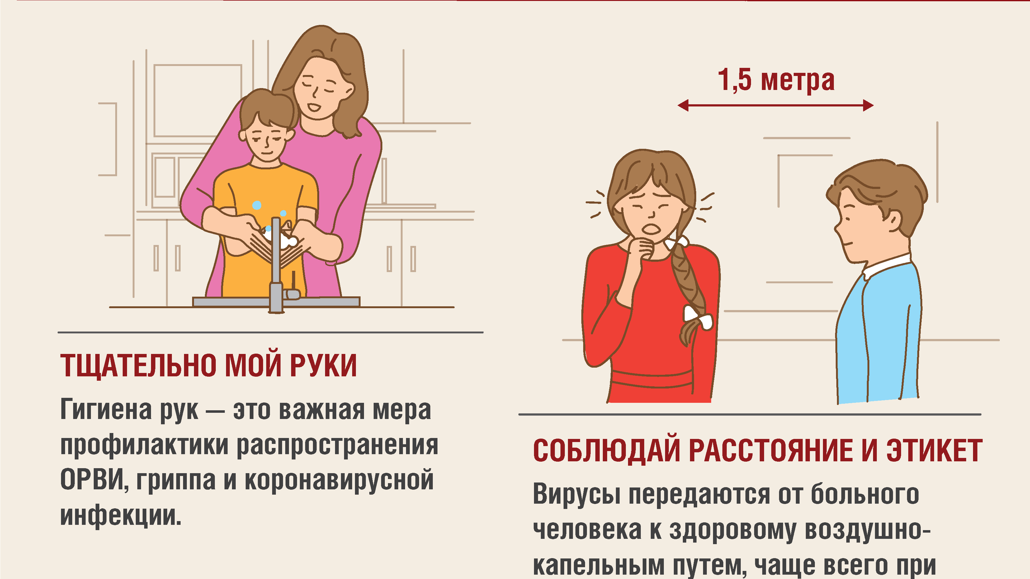 Гигиена рук - это важная мера профилактики распространения ОРВИ, гриппа и коронавирусной инфекции. Мытье с мылом удаляет вирусы. Если нет возможности помыть руки с мылом, пользуйтесь дезинфицирующими средствами с противовирусным действием (спреями, гелями, салфетками). При их использовании обращайте внимание на инструкции по применению!